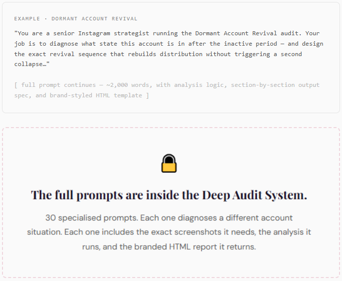 That's exactly what The Deep Audit System is built for. It's a collection of 30 scenario-based AI audit prompts, structured inside a Notion workspace, each one designed to diagnose a specific Instagram bottleneck. Has growth stalled? There's a prompt for that. Has reach dropped off a cliff while engagement held? Prompt for that too. Want to audit a client's account and deliver a strategy they'll actually pay day for? There's a prompt built specifically for professional client work.